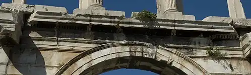 Even a casual examination of this arch, with a few of the many preserved Roman triumphal arches[5] in mind, reveals the significant design variation between the two structures. The number of arched passageways of the lower level of Roman triumphal arches was variable as was the presence of a secondary passageway along the long axis of the structure; as a dipylon arch with a single passageway, the lower level of the Arch of Hadrian falls within the gamut of the architectural genre. Roman triumphal arches, however, typically have a massive, solid attic (upper level), often filled with a dedicatory inscription and sculptural decoration. In addition, Roman arches typically supported major stone or bronze statuary, often including a quadriga (four-horse chariot) or similar at top center. As Willers notes, the design of the Arch of Hadrian has a very refined upper level that does not allow the mounting of major decoration on top of the attic.