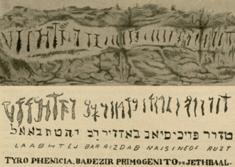 In the 1930s, Brazilian archaeologist Bernardo de Azevedo da Silva Ramos studied the mountain, hoping that it could provide evidence for his beliefs that "there existed a pre-Columbian civilization on the American Continent contemporary with the apogee of Phoenician and Greek expansion in the Mediterranean."[8] Ramos traveled to Pedra da Gávea, wrote down the markings described by the IHGB, and then with the aid of a rabbi in Manaus,[2] he claimed to have "succeeded in deciphering the inscriptions".[9] According to him, the inscription, when scanned from right to left (the direction that Phoenician is written), reads "𐤋𐤀𐤀𐤁𐤇𐤕𐤄𐤉𐤁𐤀𐤓𐤓𐤉𐤆𐤃𐤀𐤁𐤍𐤀𐤉𐤔𐤉𐤍𐤄𐤏𐤅𐤓𐤅𐤆𐤕".[1][10] This inscription, when transliterated into the Latin alphabet, is said to read "TZUR FOENISIAN BADZIR RAB JETHBAAL",[1] which translates roughly to "Tyre, Phoenicia, Badezir, Firstborn of Jethbaal".[2] This supposedly refers to a ruler of Phoenicia named Baal-Eser II[a] who ruled Tyre in the mid-9th century, c. 850 BC.[2][12] Ramos subsequently published a two-volume book entitled "Inscrições e Tradições da América Pré-Histórica, Especialmente do Brasil" ("Inscriptions and Traditions of Prehistoric America, Especially Brazil") that attempted to document all evidence of supposed Phoenician inscriptions in Brazil.[b][8]
