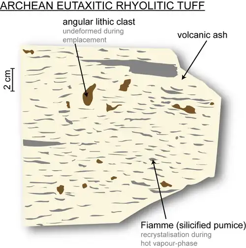 Felsic volcanic rocks also include felsic tuff that was formed when tephra was consolidated.[17] Tuff is composed of volcanic ash, glass shards and lithic fragments.[11][37] Reported eutaxitic tuff from Superior Province, Canada (Figure 3),[37] contains lenticular fiamme. When hot pumice deposits on a cool surface, it is rapidly cooled, recrystallised and welded into quartz with flame-like ending tips.[37] The eutaxitic texture represents a hot vapour-phase emplacement of the fragmented volcanic materials on the Earth's surface.[37]