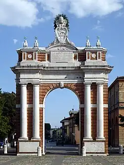 The Arch of Ganganelli (Italian: Arco di Ganganelli) or Arco di Papa Clemente XIV is a triumphal arch that stands in the town of Santarcangelo di Romagna, Emilia-Romagna, Italy. It was constructed in 1772–1777 to celebrate the elevation in 1769 of the native Cardinal Lorenzo Ganganelli to become Pope Clement XIV. Designed by the architect Cosimo Morelli, the arch led into town through the via Emilia, and until the early 21st century, allowed cars to drive through. The monument was meant to have a marble statue of the pope atop the center, but the statue, sculpted by Antonio Canova, was instead used for the Tomb of Pope Clement XIV in the Basilica of the Holy Apostles in Rome.