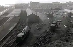 The rebuilt station consisted of two through lines with the addition of a bay platform at the north end.[3] A goods shed and yard were located to the west of the platforms. The main offices were located on the Up platform, consisting of a one and two storey ashlar building.[3] The station was closed on 1 January 1968[2] and lay derelict for a number of years, though the double tracks into the bay platform remained and were used for stabling empty DMUs from time to time.