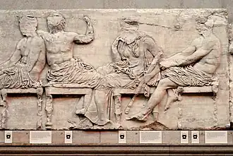 Ares (right) with Demeter, Dionysus and Hermes on the frieze of the Parthenon, ca. 447–433 BC, British Museum.