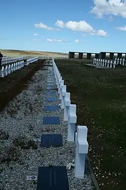 The Argentine Military Cemetery, Spanish: Cementerio de Darwin[2] (Darwin Cemetery), is a military cemetery on East Falkland that holds the remains of 236 Argentine combatants killed during the 1982 Falklands War (Spanish: Guerra de las Malvinas). It is located at Fish Creek to the east of the Darwin Settlement, the location of the Battle of Goose Green. There is a replica of the cemetery at Berazategui in Buenos Aires Province, Argentina.[3]