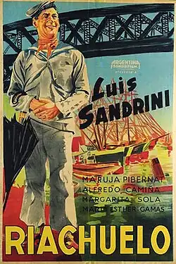 The year 1933 meant the beginning of an industrial organization in Argentine cinema due to the emergence of Argentina Sono Film and Lumiton[19]—the first optical sound film studios in Latin America.[70] and the almost simultaneous release of their first productions ¡Tango! and Los tres berretines, respectively, the first feature films with optical sound in Argentine cinema.[71] According to Matthew B. Karush, the "growth of Argentine cinema resulted from the efforts of small entrepreneurs who proved adept at catering to local tastes", citing Angel Mentasti—founder of Argentina Sono Film—as a typical example.[72] Inspired by the Hollywood model, Mentasti introduced serial industrial production to local filmmaking,[73] and his plan consisted of "[forming] a company on the basis of three films and not release the first until the second had started and the third was announced."[74] The project was born after Luis Moglia Barth contacted Mentasti with the idea of producing a film entirely starring the popular performers of revue theater, tango and radio.[71] The duo secured financing from two different capitalists, which inspired them to create the company Argentina Sono Film and undertake serial production to give them a better chance of negotiating with distributors.[74] The musical ¡Tango! premiered on 27 April 1933 and attracted audiences for its select cast of popular performers, including Luis Sandrini, Azucena Maizani, Mercedes Simone, Libertad Lamarque, Pepe Arias and Tita Merello, among others.[75] While Tango! was being released, Argentina Sono Film was shooting its second film, Dancing (1933), which had little repercussion,[76] while the great success of the third film, Riachuelo (1934), allowed the economic viability of the studio.[77]