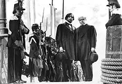 At the end of the 1900s, the incipient Argentine cinema made significant progress with the appearance of the first narrative films, which encouraged production and distribution.[41] These were the work of the Italian Mario Gallo, who had arrived in Buenos Aires a few years before as part of an opera company.[46] There is confusion as to which was the first narrative film in the country: those who date its release in 1908 consider it to be El fusilamiento de Dorrego,[45] while more recent researchers point out that this film is actually from 1910 and the first one was really La Revolución de Mayo, released in 1909.[47] For this reason, May 23 is considered National Film Day in the country, in commemoration of the release date of the latter film.[48] In the manner of the French film d'art trend, Gallo's films were closer to photographed theatre, almost always on historical topics.[45] In 1914, Glücksmann produced the oldest surviving feature film, Amalia, very similar in style to Gallo's films.[49] The film was an initiative of the Buenos Aires aristocracy, and premiered at the prestigious Teatro Colón with the attendance of President Victorino de la Plaza.[49] With the outbreak of World War I in 1914, European film production retreated, which resulted in an abundance of Argentine production in the following years.[50] As noted by Mahieu, during this time Argentine cinema "tends to abandon its character of empirical adventure, to become an entertainment industry. New distributors appeared, and in 1914 Pampa Film was founded, which produced several films."[51]