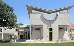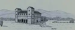 The building complex of the late antique praetorium (II) consisted of two buildings—a combined mansio (hostel)/praetorium (headquarters), and thermae (baths)—and was located in the “Westergass” area, 90 metres (300 ft) east of the Limesstrasse. The main building was oriented towards the highway, and was largely surrounded by a v-shaped ditch with a gate passage. It covered an area of 24 by 29 metres (79 ft × 95 ft). The much smaller bath an area of 7 by 14 metres (23 ft × 46 ft). Both were covered with tiled roofs, the roof tiles of which had been supplied by the Legio I Martia from Augusta Raurica. The buildings probably served as a road and rest station for state officials in transit, soldiers, and couriers of the imperial administration. In front of the Praetorium a well shaft was subsequently discovered. The praetorium and baths were probably built during the period between the rule of Constantine I or his sons and Valentinian I (330 to 340). They were in use until the 5th century. Post-roman use is proven by the indications of post holes. which come from half-timbered buildings that replaced the Roman buildings in the early Middle Ages. In their final phase, the buildings are likely to have made a neglected and run-down impression, as the residents and others disposed of their waste immediately in front of the entrances.[5]