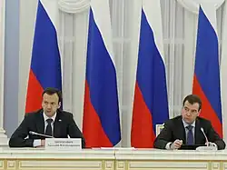Arkady Vladimirovich Dvorkovich (Russian: Арка́дий Влади́мирович Дворко́вич; born 26 March 1972)[1] is a Russian politician and economist, currently serving as the president of the International Chess Federation, FIDE. He was Deputy Prime Minister in Dmitry Medvedev's Cabinet from 21 May 2012 until 7 May 2018. He was previously an Assistant to the President of the Russian Federation from May 2008 to May 2012. He has the federal state civilian service rank of 1st class Active State Councillor of the Russian Federation.[2]
