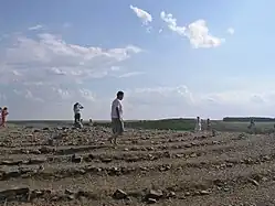 Arkaim (Russian: Аркаим) is a fortified archaeological site, dated to c. 2150-1650 BCE,[1] belonging to the Sintashta culture, situated in the steppe of the Southern Urals, 8.2 km (5.10 mi) north-northwest of the village of Amursky and 2.3 km (1.43 mi) east-southeast of the village of Alexandrovsky in the Chelyabinsk Oblast of Russia, just north of the border with Kazakhstan.[2] It was discovered in 1987 by a team of archaeologists which later came under the leadership of Gennady Zdanovich. The realization of its importance unprecedentedly forestalled the planned flooding of the area for a reservoir.[3] The construction of Arkaim is attributed to the early Proto-Indo-Iranian-speakers of the Sintashta culture, which some scholars believe represents the proto-Indo-Iranians before their split into different groups and migration to Central Asia and from there to the Iranian plateau, Indian subcontinent and other parts of Eurasia.[4]