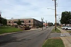 Highway 103 begins at the intersection of Lakeview Drive as Marina Road in Clarksville near the Spadra Creek Use Area along the Arkansas River. The route runs east then turns north to cross Interstate 40 (I-40) at exit 58. Now entering the central part of the city, Highway 103 becomes Rogers Avenue and has an intersection with Highway 123 before meeting US Highway 64 in downtown Clarksville.[11] Now forming a 0.42 miles (0.68 km) concurrency westbound with US 64, the highways pass the Dunlap House and Johnson County Courthouse, both listed on the National Register of Historic Places (NRHP).[9][12] The concurrency ends when Highway 103 turns north and becomes College Avenue. Highway 103 passes the historic First Presbyterian Church before entering the University of the Ozarks campus, with the majority of the campus buildings including the historic Clarksville National Guard Armory and Munger-Wilson Memorial Chapel located on the west side of the highway.[12] Following the university, Highway 103 exits Clarksville and heads northwest to Harmony through sparsely populated forested land.