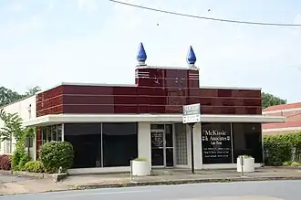 The Arkansas Louisiana Gas Company Building is a historic commercial building at 116 West 6th Avenue in Pine Bluff, Arkansas. It is a single story masonry structure with distinctive Moderne styling. Its most prominent feature is the parapet, which was Art Deco-style blue flame-shaped finials at the ends of the central raised section. Its walls include blocks of colored and clear glass, and tile elements. It was built in 1950, during a building boom that followed the end of World War II, and is the best local example of this type of architecture.[2]