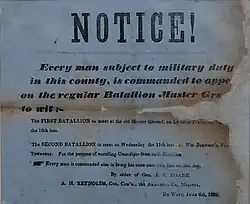 Two famous Arkansas veterans of the War with Mexico would find themselves deeply involved in the first use of the Arkansas Militia following the War with Mexico. Allen Wood, who had raised a volunteer company in Arkansas which became part of the 12th United States Infantry Regiment during the war with Mexico, was appointed as Adjutant General in 1849.[1] On September 16, 1848, Governor John Sheldon Roane, himself a former Lieutenant Colonel in the Arkansas Regiment of Mounted Volunteers during the war with Mexico, ordered General Wood to investigate a state of unrest that existed in Marion County in 1849.[2] Two warring families and their supporters vied for control of all county offices in what was known as the Tutt–Everett War. The Tutts, of the Whig Party and the Everetts, of the Democratic Party had a long running feud which erupted into bloodshed in June 1849. It was said that virtually every man in the county had taken sides in the affair.[3] General Wood raised two militia companies in Carroll County, one commanded by Captain William C. Mitchell, the other by Captain Tilford Denton to assist with the capture of members of the Everetts clan and to guard the jail. General Wood relieved Sheriff Jesse Mooney, who was thought to be a member of the Everett faction and took over the county jail in Yellville.[4] The force was eventually reduced to one company of 75 men who remained in the county from September 1849 through December 1849.[5] Almost as soon as General Wood dismissed his militia companies, members of the Everett clan broke the prisoners out of jail. General Wood resigned the office of Adjutant General in a letter to the Governor dated July 28, 1851.[6] On December 21, 1850, the Arkansas Legislature finally passed an act to pay for the militia called into service by General Wool.[7] It is likely that the experience of calling out the militia for the Marion County War lead to the passage in 1852 of a law styled "an Act to provide for the organization of the Militia when called to suppress insurrections. This law allowed the county sheriff to order elections for offices of companies activated for this purpose.[7]