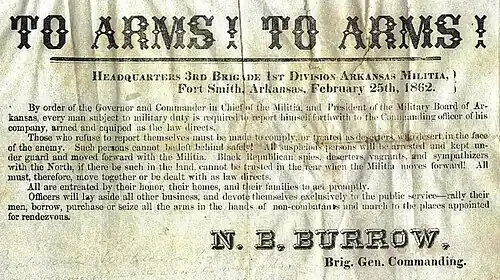 334. ^ John J. Burrow, Headquarters, Third Brigade, First Division, Arkansas Militia, Van Buren, Arkansas, to Governor Henry M. Rector, March 2, 1862, Arkansas History Commission, 150 Years Ago Today, Arkansas in the Civil War, March 2, 2012, Accessed 20 March 2012, http://www.ark-ives.com/doc-a-day/?date=3/2/2012