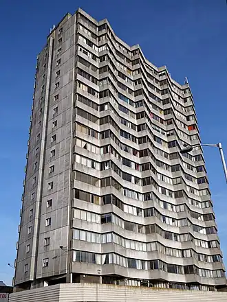 The building is designed in the Brutalist style[6] and has 142 apartments spanning 18 storeys.[2][4] It was designed by Russell Diplock & Associates, developed by Bernard Sunley Trust, and built by the contractors Bernard Sunley & Sons.[7] The sides of the building have a wave-like design, providing both inland and sea views from all apartments.[4][6]