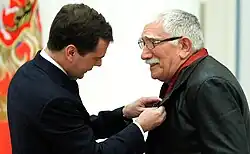 In his birthday congratulation in 2005, Armenia's second president Robert Kocharyan stated that Dzhigarkhanyan's "great popularity" is "due to [his] talent and devoted work". Kocharyan further said that "[his] art has become a peculiar standard of mutual enrichment of Armenian and Russian cultures."[35] In 2010, Armenia's current president Serzh Sargsyan described the artist as "one of the prominent figures of the modern cinema" who has "boundless talent and charm". Sargsyan stated that "The Armenian nation is proud of you."[36] In 2010, Russian president Dmitry Medvedev awarded Dzhigarkhanyan with the Order "For Merit to the Fatherland" and stated:[37]