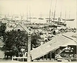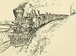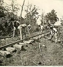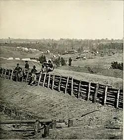 When on the defensive, the main line would be formed around a strong terrain feature (stone wall, embankment, etc.) or fieldworks, either of which ideally allowed for flanking fire. Supporting lines were placed behind the main line, on a hill overlooking it if possible but otherwise providing a ready reserve. Counter-battery fire would attempt to knock out the enemy's artillery while skirmishers harassed the attacker as they advanced. Once within range, the defending infantry attempted to drive off the enemy with superior firepower or, if timed right, a counter-charge of their own.[25] Fieldworks were used extensively during the Civil War. Even outside of sieges, both armies made every effort to construct whatever defensive fortifications that time permitted. Examples included rifle pits, abatises, wire obstacles, land mines, and palisades. Truly impressive trench systems were constructed, often thanks to the widespread use of Black laborers by both armies.[26]