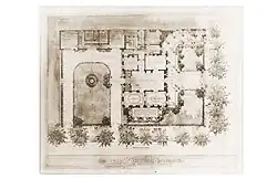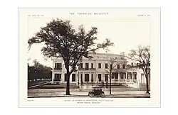 The mansion was designed by the architect Henrik Wallin in 1917 in an Italian Renaissance Revival style with interior elements of various established and experimental styles. The ten-bedroom home has nearly 26,000 square feet of living area. It is three stories over a full garden level with Granite balustraded terraces at each level. A broad hemicycle colonnade extending toward Bull Street offers a prospect of Forsyth Park. Other design features include a porte-cochère that opens into a side garden, an orangery, loggia, and sunporch. The exterior materials are granite and glazed brick. Bronze entry doors were fabricated by Bonachek of New York, with other doors in steel with bronze hardware. Windows were fabricated of steel and bronze by International Casement Company, now Hope Windows, which features the home in its promotional materials.[1][2][3]