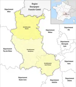 In 1800 the arrondissements of Montbrison, Roanne and Saint-Étienne were established.[2] In January 2017 the commune Andrézieux-Bouthéon passed from the arrondissements of Montbrison to the arrondissement of Saint-Étienne.[3]
