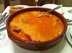 Arroz caldoso is a dish which originated in Spain. It literally means "brothy rice" and consists of broth (stock) and rice with diverse flavourings and extra ingredients.[1][2] The recipe is quite varied depending in which region of the Iberian Peninsula it is prepared. Variations of this dish range from a recipe quite similar to Italian risotto, to a rice soup, to a dish that could be mistaken for paella.
