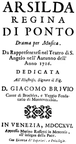 Arsilda, regina di Ponto is a dramma per musica by Antonio Vivaldi to a libretto by Domenico Lalli. The opera was first performed at the Teatro Sant'Angelo in Venice on 27 or 28 October 1716.[1][2]