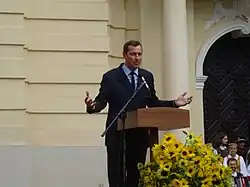 In 2003, after the merger of the Liberal Union, the Modern Christian-Democratic Union and the Lithuanian Centre Union, Zuokas was elected as the first chairman of the new Liberal and Centre Union.[7] He led the party to success in the 2004 parliamentary election, where it won 18 seats - however, he resigned from his seat in order to remain as Mayor of Vilnius.[8] It entered into a coalition led by the Homeland Union after the elections in 2008. Zuokas remained chairman of the party until 2009, when he was embroiled in a corruption scandal regarding the organization of European Capital of Culture activities in Vilnius in 2009. He allowed his favorite Gintautas Babravičius to succeed him in the post.[9]