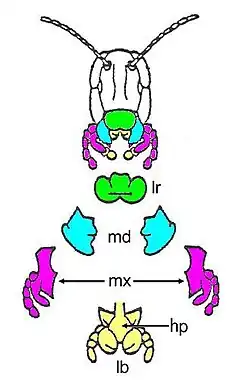 Chewing mouthparts of a grasshopper. Legend: lr, labrum; md, mandibles; mx, maxillae; hp hypopharynx; lb, labium.