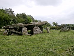 The tomb is one of many prehistoric monuments in western England and Wales to be linked with the legend of King Arthur. Some tales suggest the tomb was built to mark the location of one of King Arthur's battles, while others tell that the stones were already present when Arthur slew a giant on the spot, who fell onto the stones and left indentations in one of them, which remain to this day.[7] Others suggest the indentations on the Quoit Stone were left by Arthur's knees or elbows as he knelt there to pray.[8]