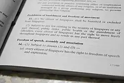 Articles 14(1) to (3) are in pari materia with Articles 10(1) to (3) of the Constitution of Malaysia, from which they were adopted following Singapore's independence from Malaysia in 1965.[5] Articles 14(1) and (2) are also somewhat similar to Articles 19(1) to (4) of the Constitution of India.