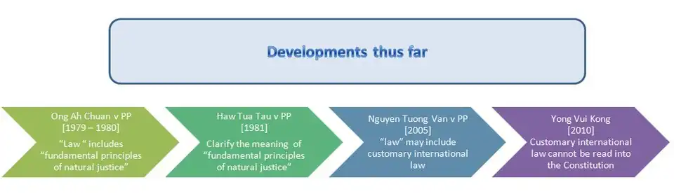 Article 9(1) states that persons may be deprived of life or personal liberty "in accordance with law". In Ong Ah Chuan v. Public Prosecutor (1980), an appeal to the Judicial Committee of the Privy Council from Singapore, it was held that the term law means more than just legislation validly enacted by Parliament, and includes fundamental rules of natural justice. Subsequently, in Yong Vui Kong v. Attorney-General (2011), the Court of Appeal held that such fundamental rules of natural justice embodied in the Constitution are the same in nature and function as common law rules of natural justice in administrative law, except that they operate at different levels of the legal order. A related decision, Yong Vui Kong v. Public Prosecutor (2010), apparently rejected the contention that Article 9(1) entitles courts to examine the substantive fairness of legislation, though it asserted a judicial discretion to reject bills of attainder and absurd or arbitrary legislation. In the same case, the Court of Appeal held that law in Article 9(1) does not include rules of customary international law.