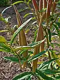 Butterfly weed is frequently grown in gardens for its showy orange flowers which are especially attractive to bees, though also visited by hummingbirds, moths, and butterflies.[19][20] It is easily grown from seeds and is difficult to transplant due to the size of its roots.[21] Grown from seed plants will take about two to three years to reach flowering size in average conditions.[19] The seeds do not require stratification and can be immediately planted, though in commercial growing they are generally moist stratified at 5 °C for 30–60 days because this increases the germination rate.[22][23][24] For other milkweeds a thin layer of mulch a layer 1–2 cm thick increases the germination rate, though specific research on butterfly weed is lacking.[24]