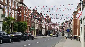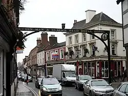 Ashbourne currently has eleven public houses and two social clubs. The most famous, the Green Man & Black's Head Royal Hotel, closed in 2011 and underwent a change of ownership in 2013, before reopening in 2018.[18] The rare gallows sign across St John's Street remains a meeting point in the town. In June 2020, the caricature of a black man's head atop the sign became the focus of racial debate.[19] It was removed after a petition had gathered more than 40,000 signatures, but it is being preserved locally.[20][21]