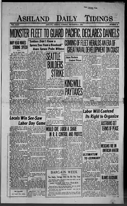 The Ashland Daily Tidings was a daily newspaper serving the city of Ashland, Oregon, United States.[1] It was managed by Edd Rountree, a well-known columnist in the state, from 1960 to 1985. Over the years the paper was owned by local families and companies including Capital Cities/ABC and Lee Enterprises before being purchased by the Medford-based Mail Tribune, which later absorbed the Tidings and itself ceased on January 13, 2023.[2]
