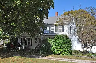 The five-bay front facade has two flat Doric pilasters and two more pilasters, located off the central bay support the broken base pediment.[3]: 5  The original door was replaced with a 19th-century door that has a 20-pane fanlight and is flanked by two flat pilasters that support the broken base pediment over the door. The main house originally had two-chimney design and another chimney was added to the east wall for a 20th-century furnace. Most of the windows in the house were replaced in the 19th century with 2-over-2 sash, except for two attic windows of each end of the gable which retain the smaller paned sashes.[3]: 2  The house includes an earlier 1+12-story ell in the rear that appears to have been a two-room central chimney structure that was integrated into the design of the main house and built in the second quarter of the 18th century.[3]: 2, 4  The chimney was replaced in the 19th century. A storage shed also sits behind the house. The property also had a dairy barn that was rebuilt following its destruction in the 1938 New England hurricane.[3]: 2