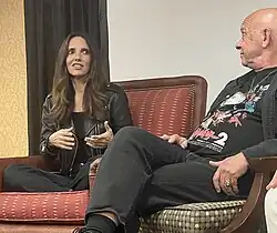 Ashley Lawrence sits next to Doug Bradley at a convention in Seattle on May 3, 2025.