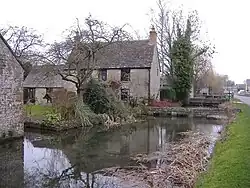 The river forms two channels – making a large square – in the parish, enclosing the western half of the village and in the past powering mills of a modest nature.[32] The south-western channel is joined by the Swill Brook and smaller tributaries join, particularly at the re-convergence of the channels. The Thames' north-eastern channel, the village channel, is deeply entrenched at the places it has frontage to more than 30 of the village's homes and where it is crossed by many flat-deck bridges, some of brick or stone arch. One public bridge, Gumstool Bridge, is not quite flat.[33] Made of limestone it is "probably medieval"; it has two arches, vertical sides rising to form a parapet 80 cm high, triangular copings and a raised, squared apex.[33] Two other bridges are consistent with a slightly pre-1800 date.[34] The manor house and adjacent church farm enjoy the vestige of a moat, its southern limb; the rest was intact for many centuries, as seen in maps of the 19th century.