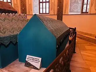 Upon her death, she was buried in Bursa, in the türbe of Orhan.[10][11][12] However, the imperial burials of Bursa were restored in the 19th century due to centuries of earthquakes and fires, and currently the Asporça sarcophagus is located in the türbe of Osman I.[13]
