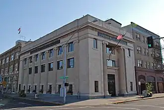 The three-story building was constructed in 1923, as the Astoria Savings Bank,[1][4] to replace that bank's previous building on the same site, destroyed by fire.[5] The bank went out of business in 1929, as a result of the stock-market crash of that year.[1] Clatsop County acquired the building in 1936,[6] and in 1938 the city of Astoria used a Public Works Administration grant to fund the conversion of the building into a new city hall,[4][7] to replace the Old Astoria City Hall, built in 1904–05. The city offices, as well as those of the Astoria School District, moved into the new city hall at the end of March 1939.[8][9] The move put Astoria's city hall in downtown, an improvement in public access over the "isolated" previous location at the edge of downtown.[10]