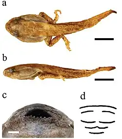 The species measure 48.7 to 53.8 mm (1.92 to 2.12 in) in males and 51.8 to 64.4 mm (2.04 to 2.54 in). There are no supernumerary tubercles and the palmar tubercles are big and oval shaped. The species is brown or red in color and it has red blotches on throughout its back. Little amounts of low webbing and somewhat dilated toe tips are present. A faint black line typically surrounds the supra-tympanal ridge.[2]