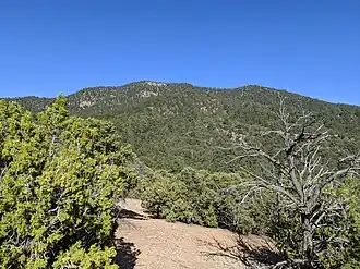 Atalaya Mountain is a mountain peak located within the Santa Fe National Forest, in northern New Mexico, United States. It is part of the Santa Fe Mountains in the Sangre de Cristo Range, a subrange of the Southern Rocky Mountains. A relevant viewscape from the city of Santa Fe, there are no higher peaks between the city and Atalaya Mountain to the east. Viewed from the city, Atalaya Mountain is framed by Sun Mountain to the right (south), Picacho Peak to the left (north), and Thompson Peak behind it. Atalaya Mountain is accessible by following the Atalaya Trail,[2] or via the Dale Ball Trails from the direction of Picacho Peak and trail marker number 36.