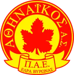 Athinaikos, officially known as Athinaikos AS FC (Greek: Αθηναϊκός Αθλητικός Σύλλογος - Athinaikos Athlitikos Syllogos), the Athenaic Athletic Association, is a Greek football club based in the suburban town of Vyronas, located in the Athens agglomeration. The club is also referred to, unofficially, as Athinaikos Vyronas.