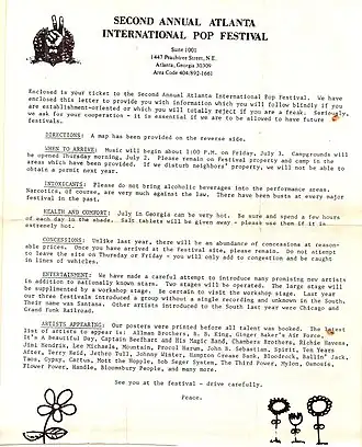 1. ^ Roberts, Scott. (July 2011). "42 Years Ago This Month: The First Atlanta International Pop Festival" Archived 2013-09-03 at the Wayback Machine. Atlanta Magazine.