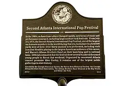 On September 15, 2012, a ceremony was held near the site of the second festival to unveil and dedicate an official historical marker commemorating the event. The marker text reads: "In the 1960s, as American culture changed rapidly, new forms of music and performance emerged, including large outdoor rock festivals. From July 3–5, 1970, the Second Atlanta International Pop Festival, one of the largest such events anywhere in the world during that era, took place in a field 600 yards west of here. Over thirty musical acts performed, including rock icon Jimi Hendrix playing to the largest American audience of his career, and Macon's Allman Brothers Band on their launching pad to national fame. Officials estimated that the festival drew several hundred thousand young people to Byron that weekend. Organized by renowned Atlanta concert promoter Alex Cooley, it remains one of the largest public gatherings in state history."[7] Official sponsors of the marker were the Georgia Historical Society, the Byron Area Historical Society, the Georgia Allman Brothers Band Association, The Allman Brothers Band Museum at the Big House and Hittin' the Note. The marker dedication ceremony was hosted by festival site landowner Tim Thornton, and featured Cooley, Byron Mayor Larry Collins, officials of the sponsoring organizations, and a crowd of festival attendees and fans.[7]