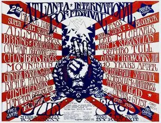 The promotional poster for the festival was one of three such posters created by artist Lance Bragg, all featuring a similar design motif, to advertise the three successive pop festivals in which promoter Alex Cooley had been involved: the first Atlanta Pop Festival and the Texas International Pop Festival, both in 1969, and the Second Atlanta Pop Festival in 1970. The posters for both Atlanta festivals are featured in the book The Art of Rock, which states, "The success of large-scale festivals, like the two Atlanta International Pop Festivals… helped create a new image for Southern rock."[38]