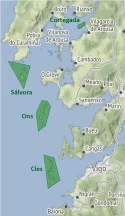 The islands of the park are located in the continental platform of the Galician Rías Baixas. The archipelagos of Cortegada and Sálvora are located in the inner and outer areas of the Ría de Arousa, respectively. The Ons archipelago, formed mainly by the Ons and Onza islands, are located at the entrance of the Ría de Pontevedra. Similarly, the Cíes Islands surround the entrance of the Ría de Vigo and comprise the islands Monteagudo, Montefaro and San Martiño.[3][4]