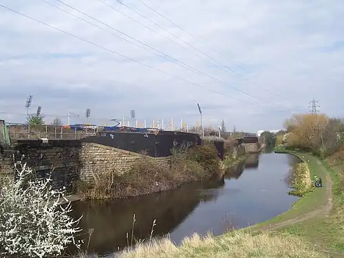 Attercliffe Station remains in 2009, seen from the Sheffield Canal, with the floodlights of the former Don Valley Stadium in the background.