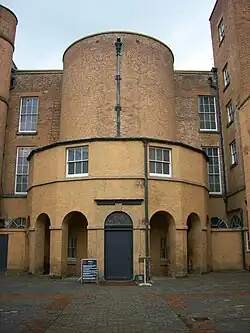 Attingham, including Cronkhill, was the seat of the Barons Berwick from the 1780s until that title became extinct in 1953. On the death of Thomas Henry Noel-Hill, 8th Baron Berwick (1877–1947), who died childless, the Attingham Estate, comprising the mansion and some 4,000 acres (1,600 ha), was gifted to the National Trust.[11][12] Attingham Park was designed by George Steuart, a follower of James Wyatt and encapsulated Tern Hall. It is the only remaining example of a country house by Steuart; he later designed St Chad's Church, Shrewsbury.[9] It was built from 1782 to 1785 for Noel Hill, 1st Baron Berwick. Lord Berwick, a former MP for Shropshire, received his title in 1784 during the premiership of William Pitt the Younger, during which he had been instrumental in the reorganisation of the East India Company.[10] The proportions have been criticised: for Simon Jenkins "The façade is uncomfortably tall, almost barracks-like, the portico columns painfully thin".[9] There is a large entrance court, with an imposing gatehouse, and two single storey wings stretch out to either side of the main block. The main reception rooms were divided into a male and female set on either side of the house.