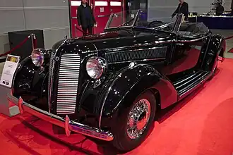The 920 featured a front-mounted six-cylinder in-line engine with a displacement of 3,281 cc.[2] A maximum output of 75 PS (55 kW; 74 hp) at 3,000 rpm was claimed along with a maximum speed of 130 km/h (81 mph).[1] A floor-mounted lever controlled the four-speed gearbox: this delivered power to the rear wheels, which represented a technological retreat from the innovative front-wheel drive configuration of the 920's predecessor.[3] The box-section chassis featured semi-independent suspension at the front and a swing-axle arrangement at the rear. The Audi 920 and the British Austin 16 were the only European cars to incorporate design cues from the 1937 Buicks for their front end grille treatment.
