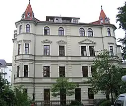 The four-storey plaster building with polygonal corner turrets in neo-Renaissance style was designed by Hans Hartl in 1891 as a tenement building. It was converted into a clinic in 1895. The building was renovated after 1945. In the 1980s and 1990s, the clinic was completely renovated in accordance with the preservation order and is registered as a listed building. The chapel interior dates back to 1895.