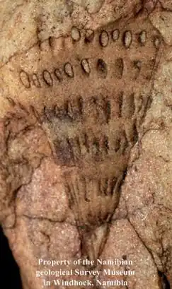 Ausia fenestrata is an Ediacaran period (635 – 539 million years ago)[2] fossil represented by only one specimen 5 cm long from the Nama Group, a Vendian to Cambrian group of stratigraphic sequences deposited in the Nama foreland basin in central and southern Namibia.[1] It has similarity to Burykhia from Ediacaran (Vendian) siliciclastic sediments exposed on the Syuzma River of Arkhangelsk Oblast, northwest Russia.[3][4][5] This fossil is of the form of an elongate bag-like sandstone cast (Nama-type preservation) tapering to a cone on one end. The surface of the fossil is covered with oval depressions ("windows") regularly spaced over the surface in the manner of concentric/parallel rows. The taxonomic identity of Ausia is unresolved.