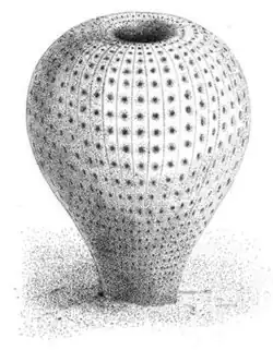 • Ausia may represent ascidians (sea squirts),[8] an invertebrate group related to the chordates.[5][9] Results of a new study of a Burykhia from Russia have shown a possible affinity of these organisms to the ascidians, which are urochordates. The Russian species is more than 90 mm across, and the rows of oval depressions are separated by structures which were probably grooves in the internal wall surface of the living organism. The study's authors interpret these fossils as the internal sand casts of a vast bag-like cavity, possibly a pharynx or branchial basket.[5] The animals represented by these two genera were thought to live in the shallow waters of an epicontinental sea, slightly more than 555-548 million years ago, and the authors feel this is probably the oldest evidence of the chordate lineage of metazoans.[5]