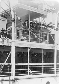 The Australian Red Cross sent a number of VADs to work in military hospitals. This included a group of 20 professional nurses and a masseuse who were recruited to work in French hospitals.[67] The group were dubbed the "Bluebirds" in reference to the colour of their uniforms specially designed from David Jones, and their service was funded by the Australian Jockey Club. Embarking on HMAT Kanowna in July 1916, they travelled to the western front to fill positions that the French Red Cross had been unable to fill due to nursing staff shortages. The nurses were accompanied by Mademoiselle Niau, a tutor tasked with teaching them French.[65] Under contract with the New South Wales division of the Australian Red Cross, the Bluebirds, were closest to the front of any of the Australian Red Cross trained nursing volunteers. Little was published about their achievements in the war until research in the late 2010s.[68] Like other privately funded volunteers in the war, did not receive Australian government recognition such as war gratuity or repatriation benefits on their return.[65]